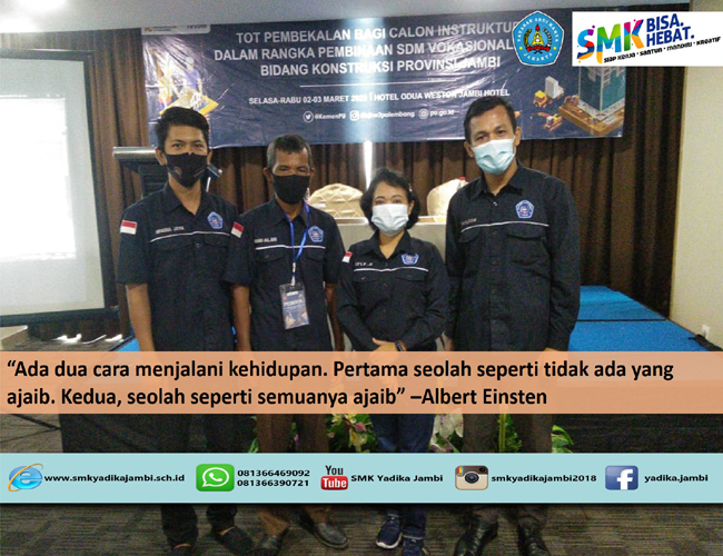 Dalam Rangka meningkatkan kompetensi dan keahlian. Maka Guru Produktif SMK Yadika Jambi dalam hal ini dari jurusan Teknik Kendaraan Ringan mengikuti kelas Training of Trainer (TOT) Pembekalan calon Instruktur dalam rangka SDM Vokasional SMK bid.Konst.Provinsi Jambi. Kegiatan ini dilaksanakan selama 2 hari, mulai tanggal 2 maret s/d 3 maret 2021, bertempat di hotel Odua Weston Jambi. Besar harapannya semoga kapabilitas keilmuan guru-guru produktif teknik kendaraan ringan semakin meningkat dan mumpuni. terutama dibidang rancang-bangun mesin dan teknik gambar.